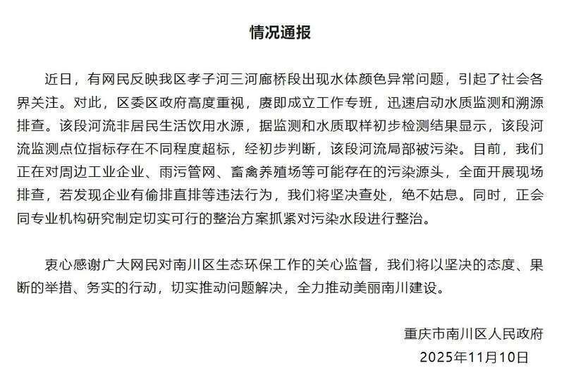 据倾盆新闻,11月10日晚,重庆市南川区东说念主民政府发布情况通报。