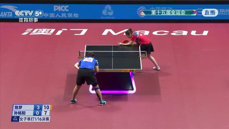 11月11日,第十五届全运会乒乓球女单1/16决赛,陈梦迎来本届全运会首秀。算作赛会4号种子的陈梦以11-5、11-5、11-3、11-7,直落四局治服上海队选手孙铭阳,到手晋级女单16强。