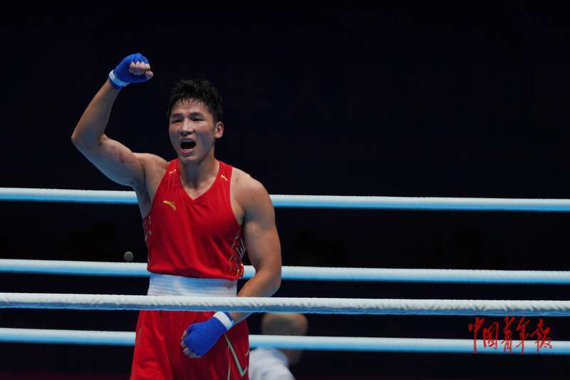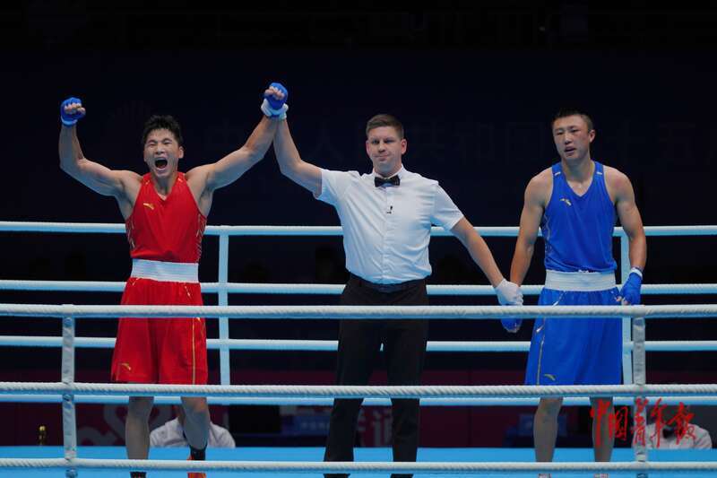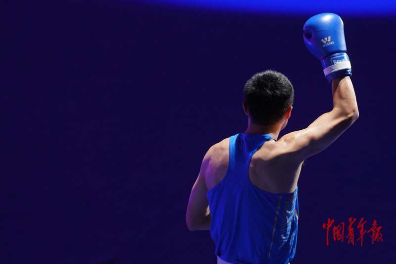 11月11日,广东深圳,宝安体育中心体育馆,拳击须眉80公斤级决赛,四川队选手王小保奏凯后挥拳庆祝。中青报·中青网记者 田嘉硕/摄