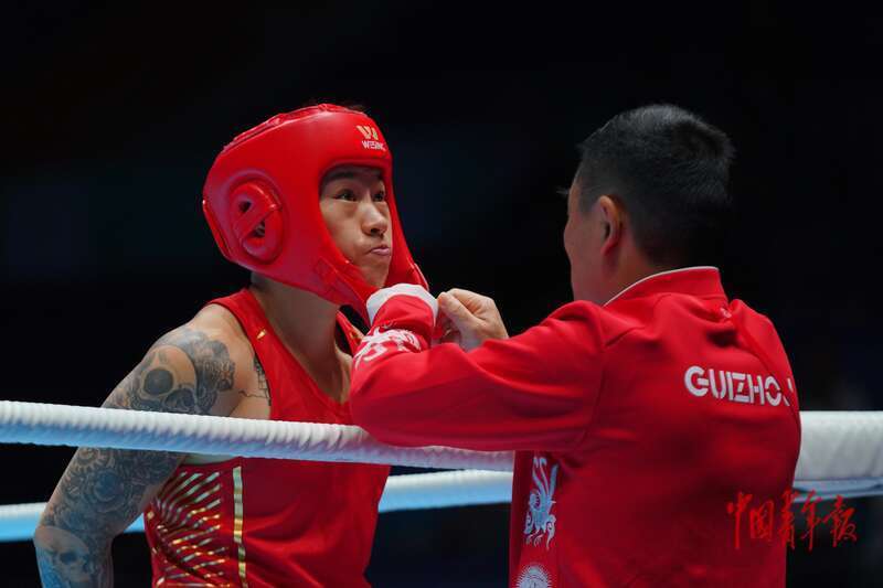 11月11日,广东深圳,宝安体育中心体育馆,拳击女子60公斤级决赛前,贵州队评释注解为杨成宇穿着护具。中青报·中青网记者 田嘉硕/摄
