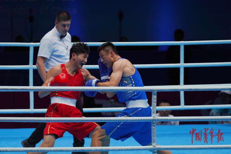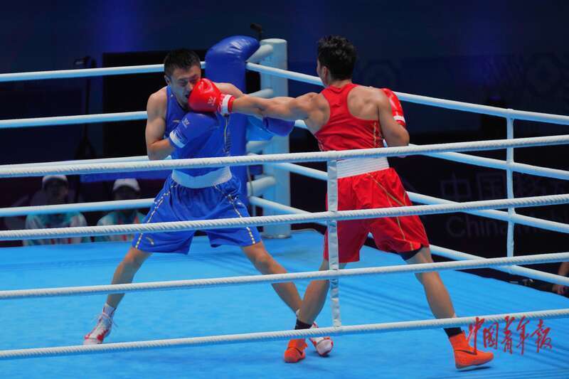 11月11日,广东深圳,宝安体育中心体育馆,拳击须眉80公斤级决赛,四川队选手王小保(右)在比赛中尽力出拳。中青报·中青网记者 田嘉硕/摄