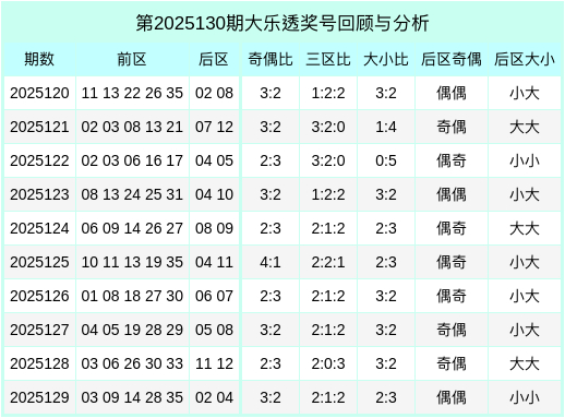 大乐透第25129期开出奖号:03、09、14、28、35 + 02、04。其中前区号码三区比为2:1:2,奇偶比为3:2,大小比为2:3,后区开出偶数+偶数、极少+极少。